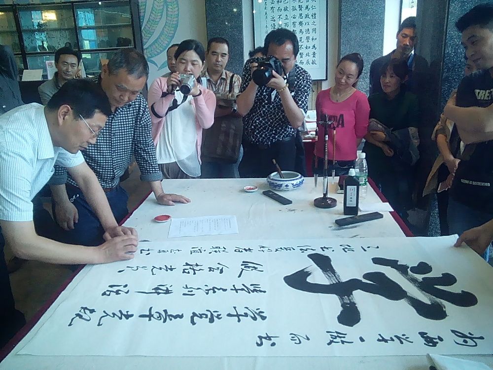 書法秀精彩紛呈,高潮迭起。剛開始大家還刻意謙讓,后來簡直成了競技上場,大家爭先恐后,唯恐寫不上,沉浸在忘我的狀態中,書者和觀者都忘了時間,連下班的號聲都沒聽見。最后,在工作人員的一再提醒下,大家才依依不舍意猶未盡地陸續離開。